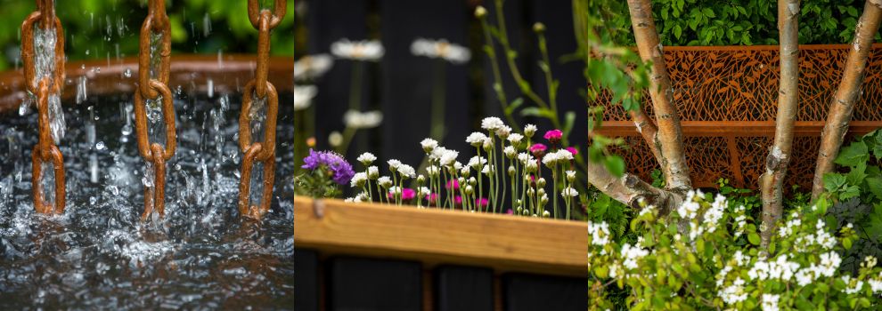 Framed by rust-effect Corten steel, 'dead hedges' are actually full of life! With hidden hedgehog boxes, they house garden prunings and create habitats for birds, insects and more.