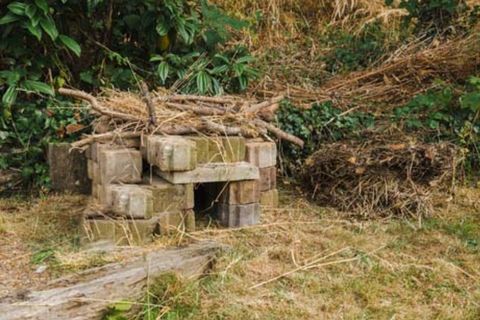 Cover the top with soil, logs, twigs and leaves. This keeps the house warm and attracts insects for hedgehogs to eat.