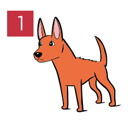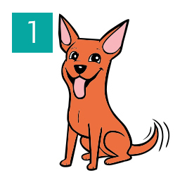 Smooth hair, the mouth is open and relaxed, ears are in a natural position, the tail is wagging and the eyes are a normal shape.