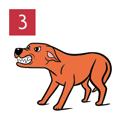 Stiffened body posture, weight forward, ears are up, hair raised, eyes looking at you – pupils dark and enlarged – tail is up and stiff, wrinkled nose.
