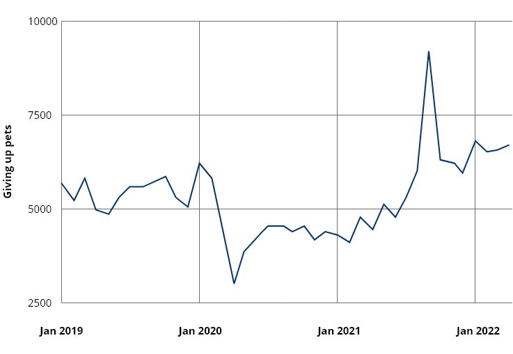 Search terms relating to giving up pets currently total around 6,600 per month. This is an increase from around 4,400 in 2021 (Figure 15).