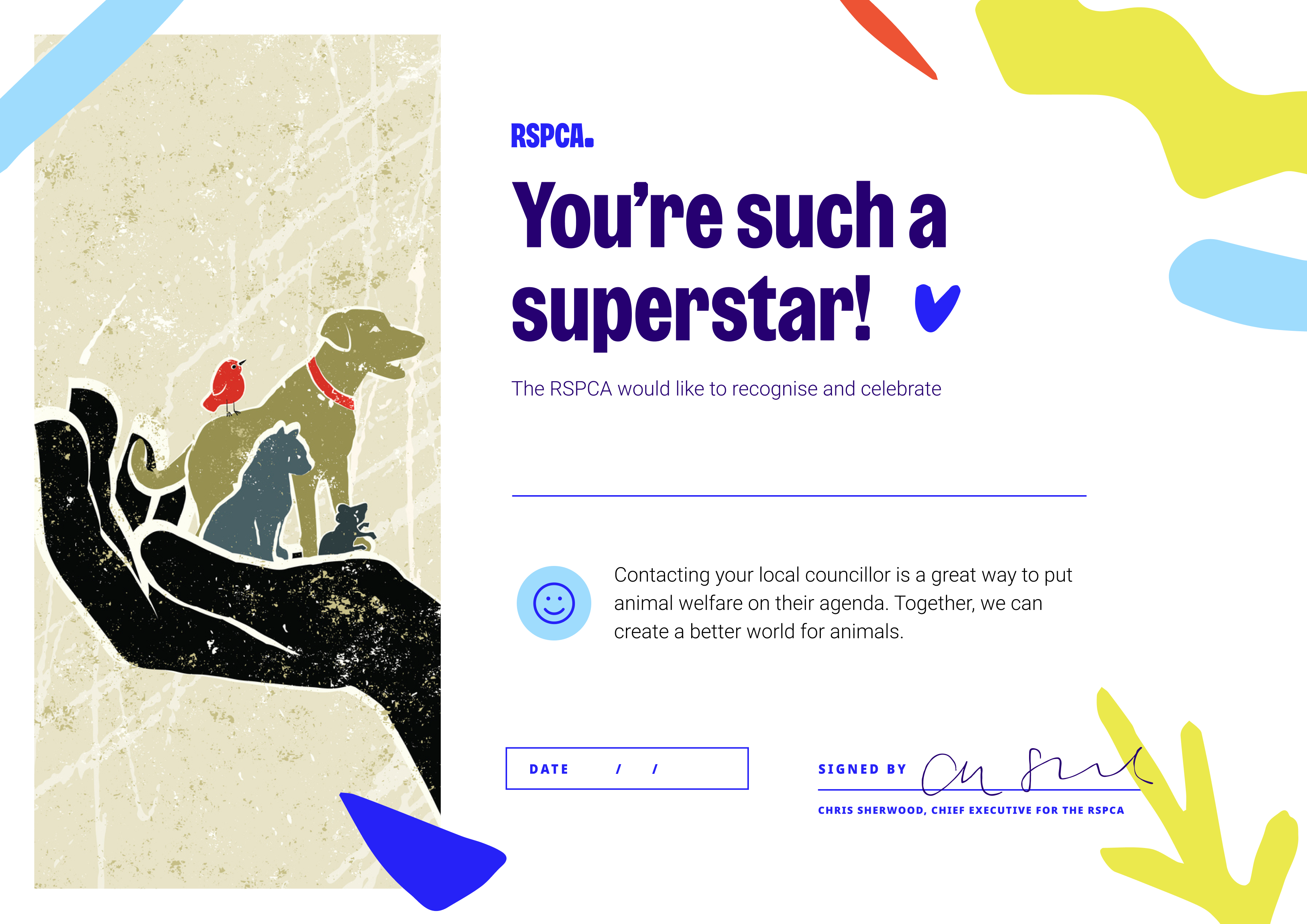- Encourage them to pledge their support for animals through our manifesto
