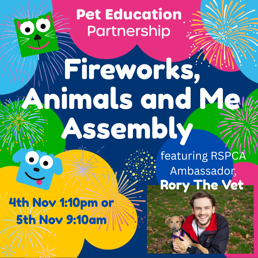 Join the Pet Education Partnership’s ‘Fireworks, Animals and Me’ assembly on Zoom, designed especially for schools and educators. This FREE interactive session features videos from children’s TV star and RSPCA Ambassador Rory The Vet, who will guide young learners on how to help animals feel safe during fireworks, exploring practical ways to keep pets calm and protected.