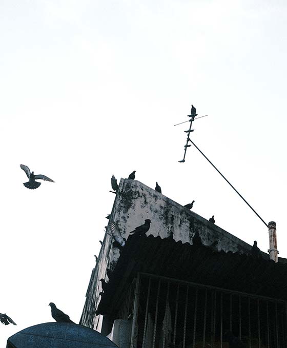 I was touring around the narrow back alleys of Little India in Singapore one summer's evening when I noticed this group of pigeons above me. They were rising and landing periodically in response to noises below. I waited until a number of them spread their wings, making striking monochrome silhouettes while overexposed. Despite the chaotic layers of corrugated iron and aging concrete, they seemed to have found their place and be enjoying themselves.