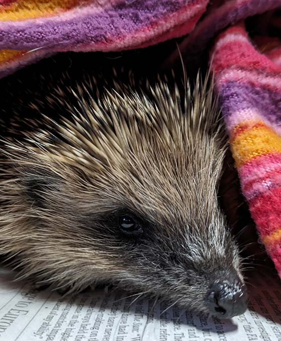I was volunteering at a wildlife rescue centre when I took this photo. After putting some food in the cage, I noticed the hedgehog creeping out from under the blanket until it framed their head perfectly. I held my phone higher than usual to show off the blanket and the hedgehog's beautiful pale spines, which contrast with the dark background.