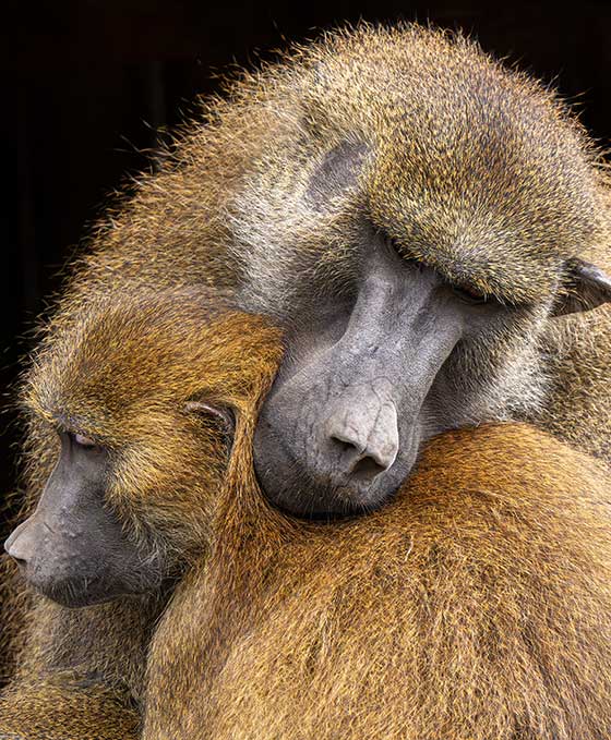I was wandering around Yorkshire Wildlife Park one day with my camera and noticed two baboons peacefully embracing. I wanted to create an image of calm that relayed the love between the pair, so I isolated them against a dark background to make sure there were no other distractions.