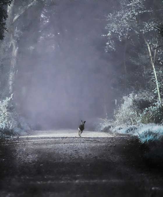 I’d gone to the bluebell woods at sunrise to photograph deer. It was so misty, magical and peaceful. I sat waiting, listening to the silence (with pins and needles in my legs) but there were no deer. On the way back I noticed a hare sprinting along the path. I dropped to my knees and got a photo just as they reached the sunbeam. The hare, quite unaware of my presence, wandered into the light as if saying: "This is my world!".